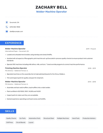 Build a professional welder-machine operator resume in minutes. Browse through our resume examples to identify the best way to word your resume. Then choose from 5+ resume templates to create your welder-machine operator resume.