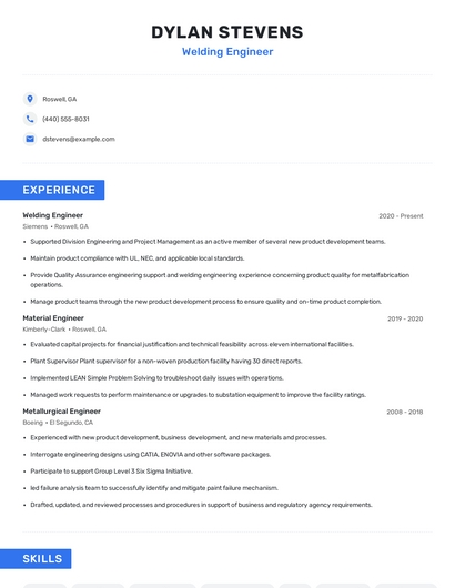 Build a professional welding engineer resume in minutes. Browse through our resume examples to identify the best way to word your resume. Then choose from 5+ resume templates to create your welding engineer resume.