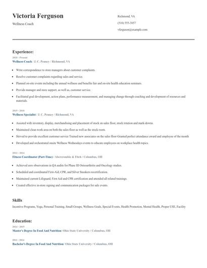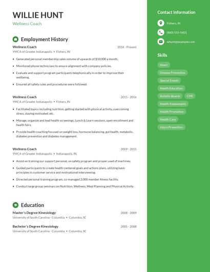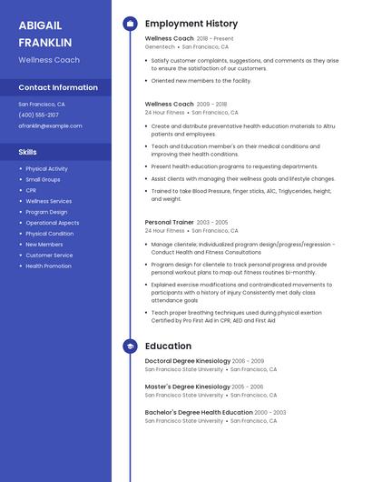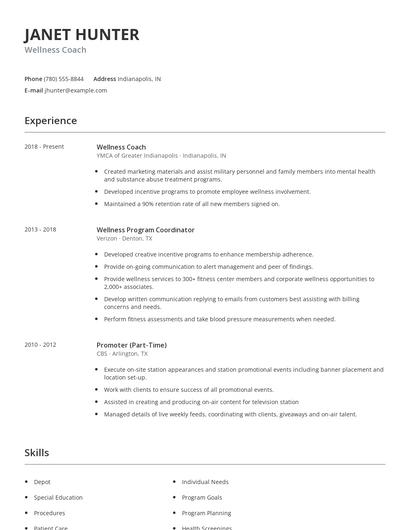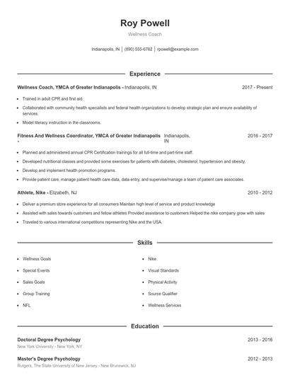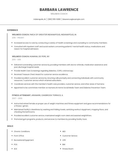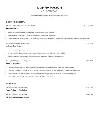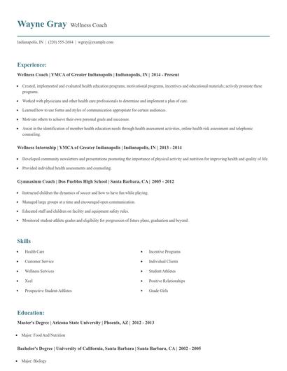 Build a professional wellness coach resume in minutes. Our AI resume writing assistant will guide you through every step of the process, and you can choose from 10+ resume templates to create your wellness coach resume.Compare different wellness coaches