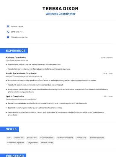 Build a professional wellness coordinator resume in minutes. Browse through our resume examples to identify the best way to word your resume. Then choose from 5+ resume templates to create your wellness coordinator resume.