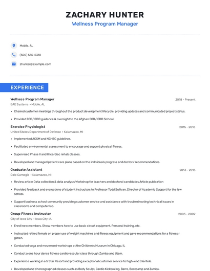 Build a professional wellness program manager resume in minutes. Browse through our resume examples to identify the best way to word your resume. Then choose from 5+ resume templates to create your wellness program manager resume.