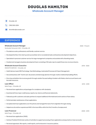 Build a professional wholesale account manager resume in minutes. Browse through our resume examples to identify the best way to word your resume. Then choose from 5+ resume templates to create your wholesale account manager resume.