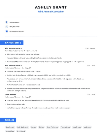 Build a professional wild animal caretaker resume in minutes. Browse through our resume examples to identify the best way to word your resume. Then choose from 5+ resume templates to create your wild animal caretaker resume.