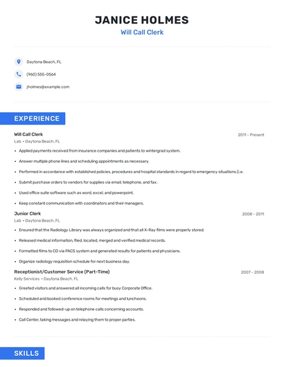 Build a professional will call clerk resume in minutes. Browse through our resume examples to identify the best way to word your resume. Then choose from 5+ resume templates to create your will call clerk resume.