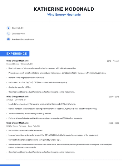 Build a professional wind energy mechanic resume in minutes. Our AI resume writing assistant will guide you through every step of the process, and you can choose from 10+ resume templates to create your wind energy mechanic resume.7. Dc