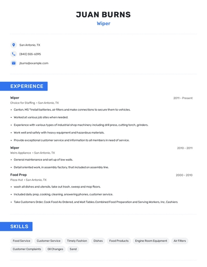 Build a professional wiper resume in minutes. Our AI resume writing assistant will guide you through every step of the process, and you can choose from 10+ resume templates to create your wiper resume.7. Routine Maintenance