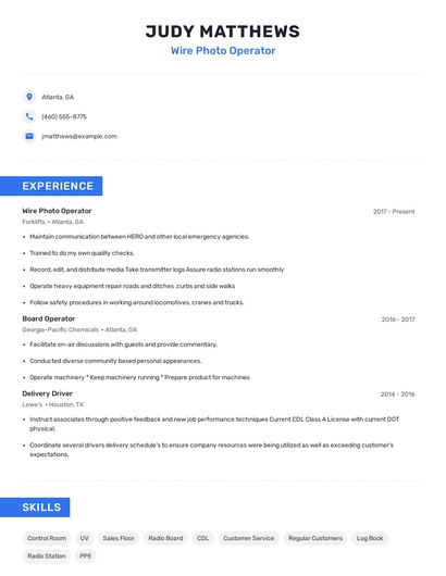 Build a professional wire photo operator resume in minutes. Our AI resume writing assistant will guide you through every step of the process, and you can choose from 10+ resume templates to create your wire photo operator resume.7. Safety Procedures