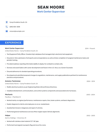 Build a professional work center supervisor resume in minutes. Browse through our resume examples to identify the best way to word your resume. Then choose from 5+ resume templates to create your work center supervisor resume.