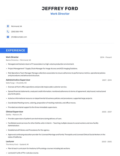 Build a professional work director resume in minutes. Browse through our resume examples to identify the best way to word your resume. Then choose from 5+ resume templates to create your work director resume.