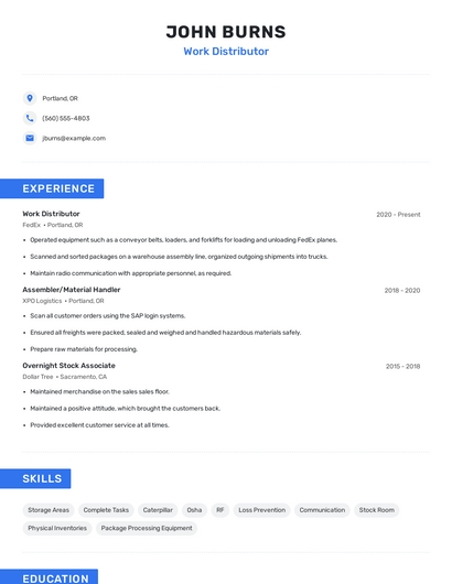 Build a professional work distributor resume in minutes. Browse through our resume examples to identify the best way to word your resume. Then choose from 5+ resume templates to create your work distributor resume.