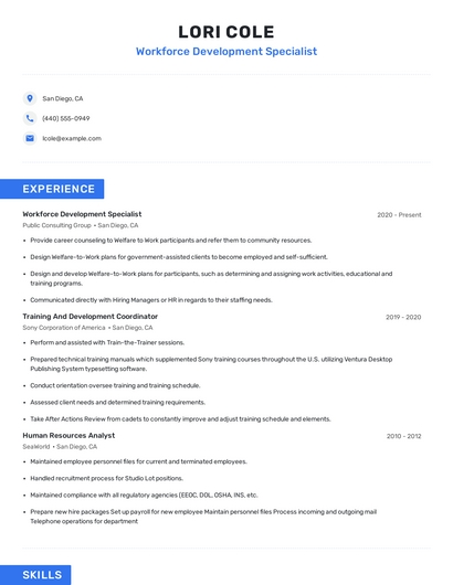 Build a professional workforce development specialist resume in minutes. Browse through our resume examples to identify the best way to word your resume. Then choose from 5+ resume templates to create your workforce development specialist resume.