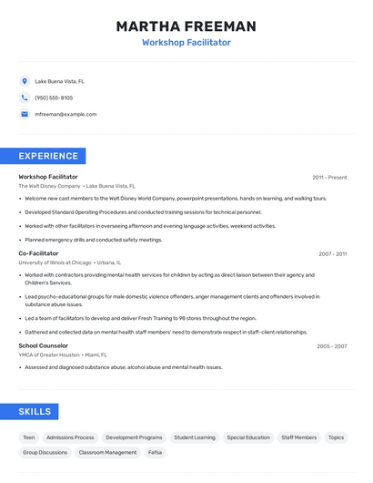 Build a professional workshop facilitator resume in minutes. Browse through our resume examples to identify the best way to word your resume. Then choose from 5+ resume templates to create your workshop facilitator resume.