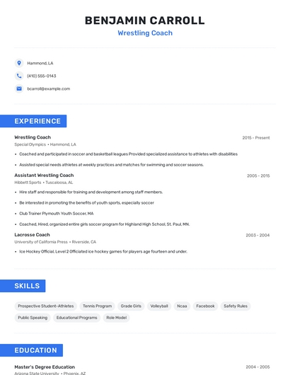 Build a professional wrestling coach resume in minutes. Browse through our resume examples to identify the best way to word your resume. Then choose from 5+ resume templates to create your wrestling coach resume.