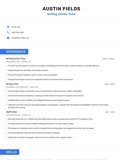 Build a professional writing center tutor resume in minutes. Browse through our resume examples to identify the best way to word your resume. Then choose from 5+ resume templates to create your writing center tutor resume.