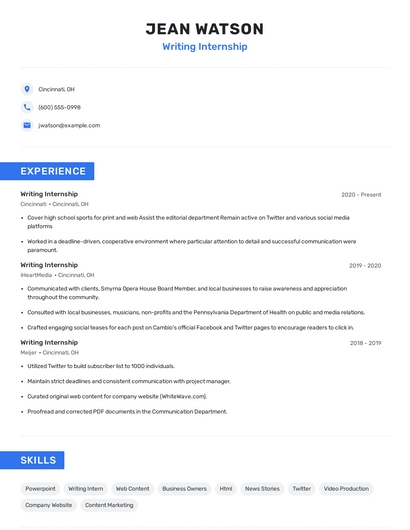 Build a professional writing internship resume in minutes. Browse through our resume examples to identify the best way to word your resume. Then choose from 5+ resume templates to create your writing internship resume.