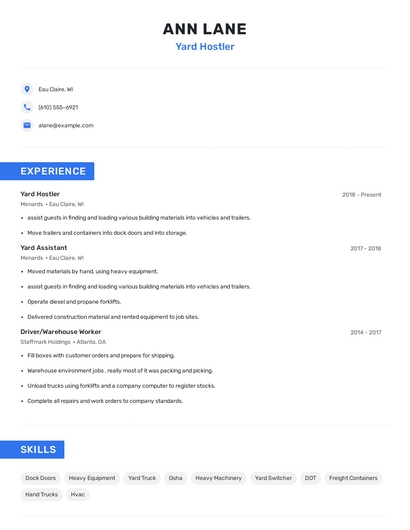 Build a professional yard hostler resume in minutes. Browse through our resume examples to identify the best way to word your resume. Then choose from 5+ resume templates to create your yard hostler resume.