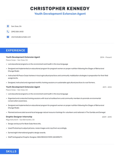 Build a professional youth development extension agent resume in minutes. Our AI resume writing assistant will guide you through every step of the process, and you can choose from 10+ resume templates to create your youth development extension agent resume.What skills help Youth Development Extension Agents find jobs?