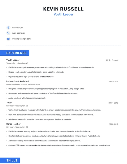 Build a professional youth leader resume in minutes. Browse through our resume examples to identify the best way to word your resume. Then choose from 5+ resume templates to create your youth leader resume.
