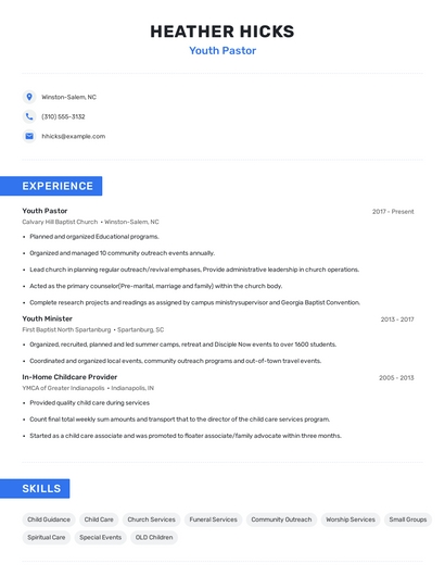 Build a professional youth pastor resume in minutes. Browse through our resume examples to identify the best way to word your resume. Then choose from 5+ resume templates to create your youth pastor resume.