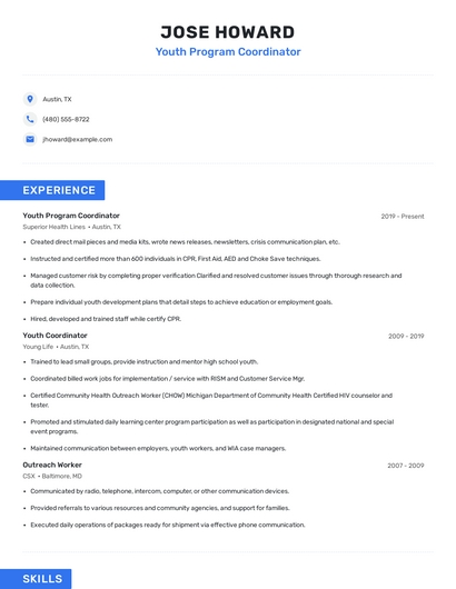 Build a professional youth program coordinator resume in minutes. Browse through our resume examples to identify the best way to word your resume. Then choose from 5+ resume templates to create your youth program coordinator resume.