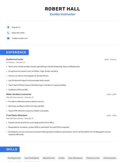 Build a professional zumba instructor resume in minutes. Browse through our resume examples to identify the best way to word your resume. Then choose from 5+ resume templates to create your zumba instructor resume.